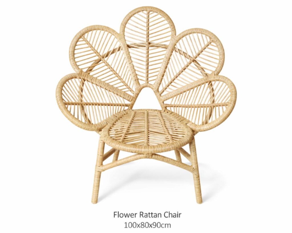 Flower Chair – AK2 Product Code: AK2 Category: Indoor Material: Natural Rattan Size: 100 x 80 x 90 cm Color/Finish: Brown MOQ: 60 pcs Lead Time: 6–8 Weeks FOB Price: –