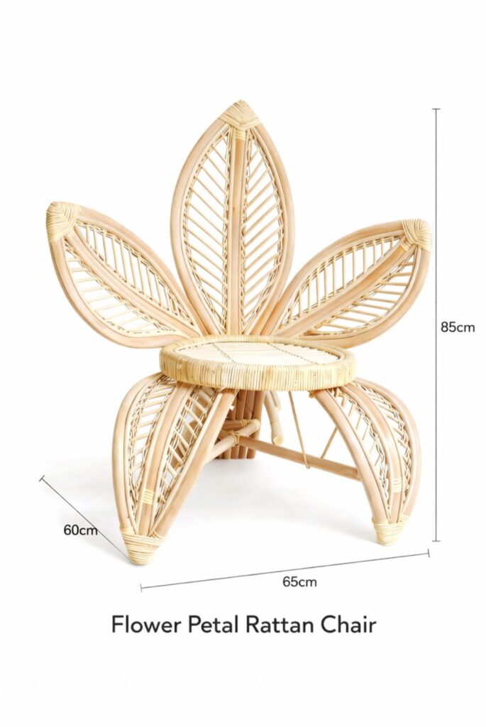 Description: Unique flower-inspired rattan chair with artistic curves. A statement piece perfect for living rooms, lounges, and decorative interior projects.